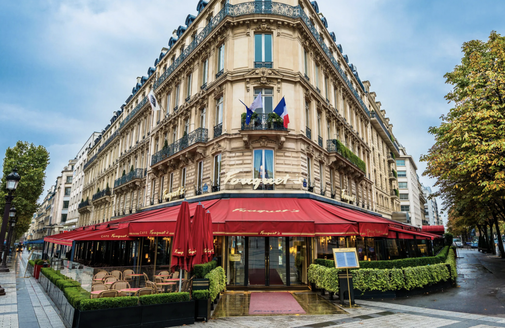 Le Fouquet’s Paris – Trônant sur les Champs-Élysées, cette brasserie classée monument historique est le gardien d’une certaine mémoire parisienne, temple du septième art. Sous ses stores rouges emblématiques, on y déguste des classiques de brasserie magnifiés, du caviar Osciètre au millefeuille Fouquet’s, dans un décor de boiseries, velours carmin et portraits Harcourt, où luxe et tradition s’entremêlent.