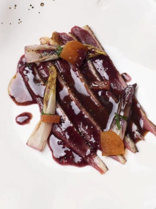 Installés dans la salle à manger du premier étage, une légère appréhension se mêle à l’excitation, tel un prélude à une première à l’Opéra de Vienne. Une coupe de champagne Chartogne-Taillet, quelques gougères aériennes, et le ballet peut commencer. Les amuse-bouche, présentés sur un plateau d’argent, donnent le ton : un samossa et vernis d’un plus bel effet, suivi d’un tourteau, kiwi, nori relevé d’une pointe de yuzu kosho, et d’une praire délicatement posée dans une nage de pomme verte. Une entrée en matière remarquable. Les noix de Saint-Jacques de plongée, accompagnées de gwell à la betterave et de puntarelle, bien que très plaisantes et d’un dressage superbe, se révèlent légèrement moins audacieuses, comme si le chef se réservait encore. La caille, servie en deux temps, surprend par sa modernité insoupçonnée et son exécution impeccable, surtout lorsqu’elle est escortée d’un Vosne-Romanée, un accord qui emporte instantanément l’adhésion.